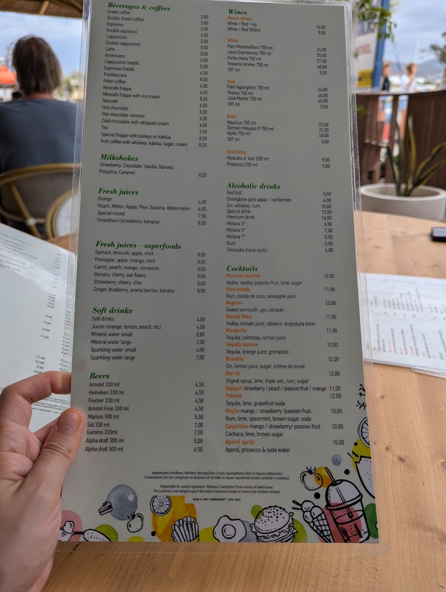 Drink offerings cover a variety of freshly prepared beverages including fresh juices, frappes, coffee, cocktails, beer, and wine. These drinks cater to both daytime refreshment needs and evening social gatherings.